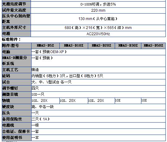 HMAS-D5Z/10Z/20Z/30Z/50Z維氏硬度測量分析系統(tǒng)是本公司推出的第六代光機(jī)電一體化的高新技術(shù)產(chǎn)品,該機(jī)器造型新穎,具有良好的可靠性,可操作性和直觀性,是采用精密機(jī)械技術(shù)、光電技術(shù)、圖形圖像處理技術(shù)和材料硬度分析軟件的新型維氏和努普硬度測試儀器。 性能特點(diǎn) 1、外觀新穎,采用微機(jī)控制自動轉(zhuǎn)塔通過軟件執(zhí)行操作,進(jìn)一步實(shí)現(xiàn)測量的智能化。 2、設(shè)備擯棄傳統(tǒng)繁瑣測量步驟,測量方法更簡便 3、設(shè)備自帶打印功能,可將相關(guān)測量參數(shù)打印并保存 4、設(shè)備能對被測材料進(jìn)行拍攝并能對其組織進(jìn)行分析和讀取 5、可調(diào)節(jié)測量光源強(qiáng)弱,可預(yù)置試驗(yàn)力保持時(shí)間、并能切換維氏和努氏試驗(yàn)方法 適用范圍: 熱處理、碳化、淬火硬化層,表面覆層,鋼,有色金屬和微小及薄形零件等.配備努氏壓頭后能測定玻璃、陶瓷、瑪瑙、人造寶石等較脆而又硬材料的努氏硬度. 技術(shù)參數(shù):